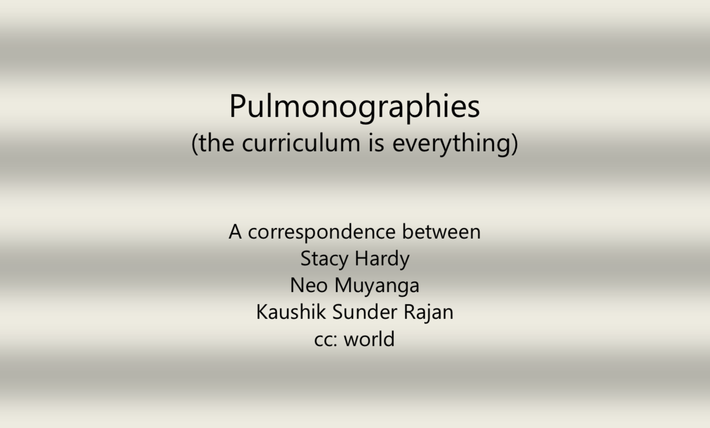 we have been asked to think about this coronaviral moment in the context of longer duree histories and structures. we have been asked to articulate our reflections in the form of a correspondence. the ethos of “cc: world”, as we understand it, is to look and think before and beyond the moment. to respond to this ethos, we must look and think before and beyond the moment of this exercise. hence, we offer a correspondence that precedes, exceeds and incorporates the task we have been set. the “correspondence” of cc: world emerges out of a longer duree correspondence, itself translocal, following different routes and trajectories, still emergent. our respective practices are different, but we have shared stakes in pedagogy. in a practice of teaching and learning, including teaching and learning from each other. what we offer here, therefore, is a syllabus of shared breath.
